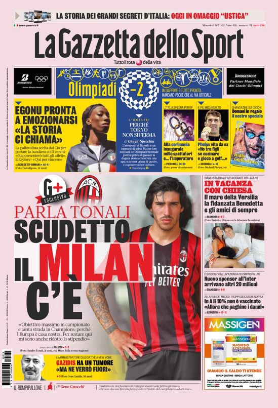 Gazzetta dello sport Trasmette messaggi di Sandro Tonali Il Milan lotta per lo scudetto.. Il nome Zlatan Ibrahimovic Sembra decisamente. “Giocare con Ibra dà stimoli incalcolabili. Ibra ti carica anche quando non gioca. Lo fa anche adesso che non si allena con noi, è sempre presente. Sa che abbiamo bisogno di lui, ma anche lui ha bisogno di noi. Come uno”, dice Tonali. Il quotidiano ha escluso l’ipotesi che Paulo Dybala possa lasciare la Juventus. L’argentino, invece, non è a mercato e a breve comincerà a parlare di un prolungamento del contratto. La Juventus, inoltre, può immaginare un prestito da Miralem Pjanic, che vorrebbe rientrare, ma a ingaggio ridotto.