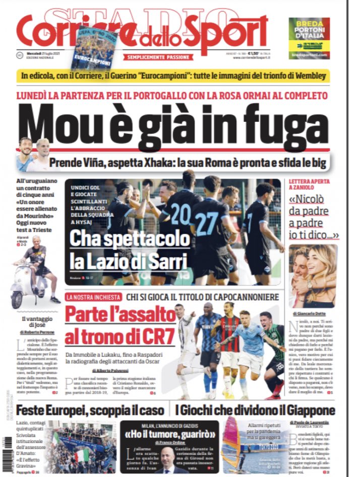 Corriere dello Sport crede che “Mou si sta già muovendo”. Mourinho ha iniziato alla grande con la Roma e ora stanno arrivando altri acquisti, “Viña è pronto, Xhaka aspetta: la Roma è pronta a sfidare gli adulti”. La collina Matías Viña collega domani secondo le informazioni di Palmeiras. Prezzo: 11 milioni di euro più 3 milioni di euro di bonus. Si avvicina anche Granit Xhaka dell’Arsenal.