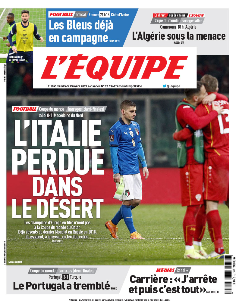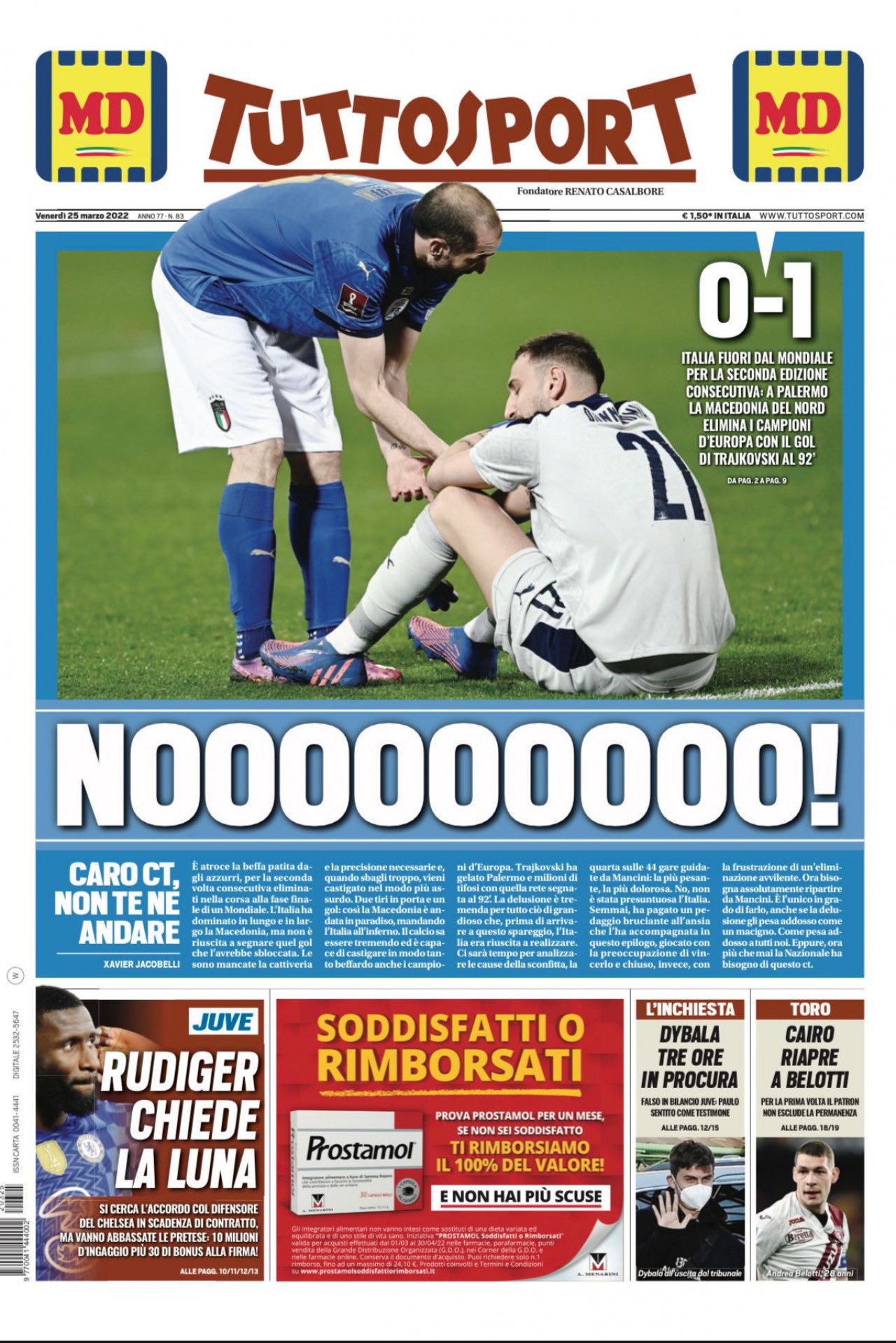 Tutosport Non credere ai tuoi occhi. “Nooo”. Non di nuovo. Corriere dello Sport Senti il calore dal basso. “All’inferno”. Dopo aver segnato un gol al 92′ (0-1 contro la Macedonia del Nord), i titoli dei giornali hanno coperto le prime pagine dopo l’ultima sconfitta dell’Italia nelle qualificazioni ai Mondiali. “Proprio come la Juventus una settimana fa. Prova, credici, ingannati, crolla: il calcio italiano sembra farcela da solo. Contro la Svezia (WC qualificazione playoff 2017, mio riferimento). Era peggio della Svezia. Un EC Una bella ironia tra i due Mondiali che hanno perso una lite con l’oro”., scrive La Repubblica. Ma Tuttosport ha ancora un appello per Roberto Mancini in un titolo di colonna: “Caro Capitano della Nazionale, non mollare”. Presidente dell’Associazione Gabriel Gravina è d’accordo, “Spero che Mancini continui”. Lo stesso Mancini ha esordito all’EC la scorsa estate Nella sua risposta: “È stata l’esperienza più straordinaria della mia vita. È stata una grande delusione. È troppo presto per parlare del futuro”.. Se Mancini sceglierà di dimettersi, la Gazzetta dello Sport ipotizza Paolo Cannavaro come possibile sostituto. Blagoja Milevski è il capitano della nazionale della Macedonia del Nord Cospargere di sale le ferite italiane Dopo la partita: “Abbiamo vinto con un gol in due tiri, una vittoria all’italiana”, lui dice. E torniamo a quei titoli di disperazione e alle fitte dell’inferno. Marco Verretti Forse sai tutto. “È un sogno”dice il centrocampista in lacrime dopo il fischio finale.