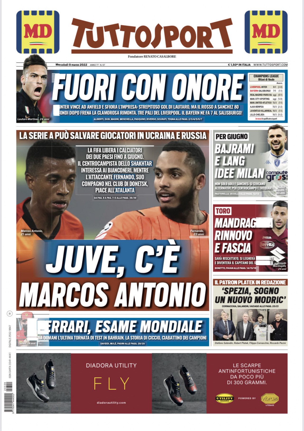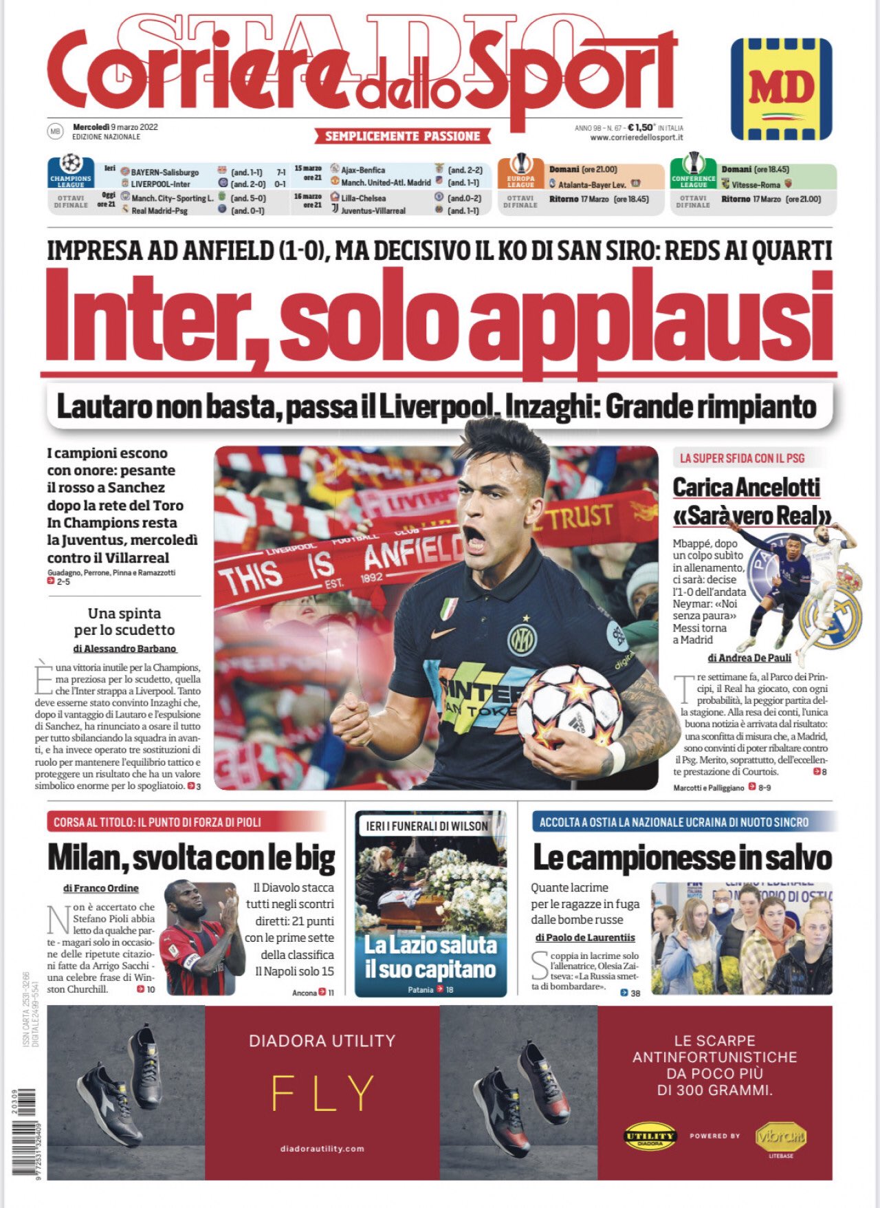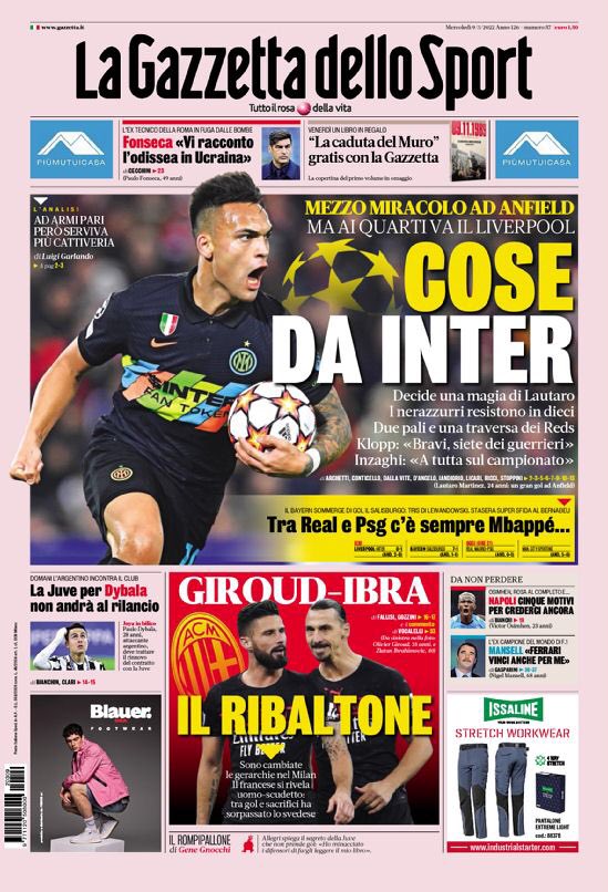 Corriere dello Sport E il Tutto Sport Elogia l’Inter (1-0 contro il Liverpool). carriera sportiva: “Solo un applauso, Inter”.. Tuttosport: “licenziato con onore”. Il marcatore Lautaro Martinez: “Abbiamo dimostrato di essere ad alto livello ma dobbiamo migliorare nei dettagli”dice, che viene interpretato come passa ad Alexis Sánchezchi è stato espulso. Martinez continua: “Peccato che giochiamo con 10 ragazzi, sono i dettagli che influiscono sulla partita”. Un’interpretazione emerge da Simone Inzaghi. Rispondendo alla domanda sul perché non ha incaricato Edin Dzeko di inseguire l’importantissimo gol del 2-0. “Hai salvato Dzeko, sarà molto importante nella prossima partita”. Quella partita contro il Torino. Domenica sera. Con Milan, Atalanta e Inter fuori, La Stampa sottolinea che solo la Juventus ora può salvare il calcio italiano, che da cinque anni non vede una squadra in semifinale e non vince lo scudetto da dodici anni.