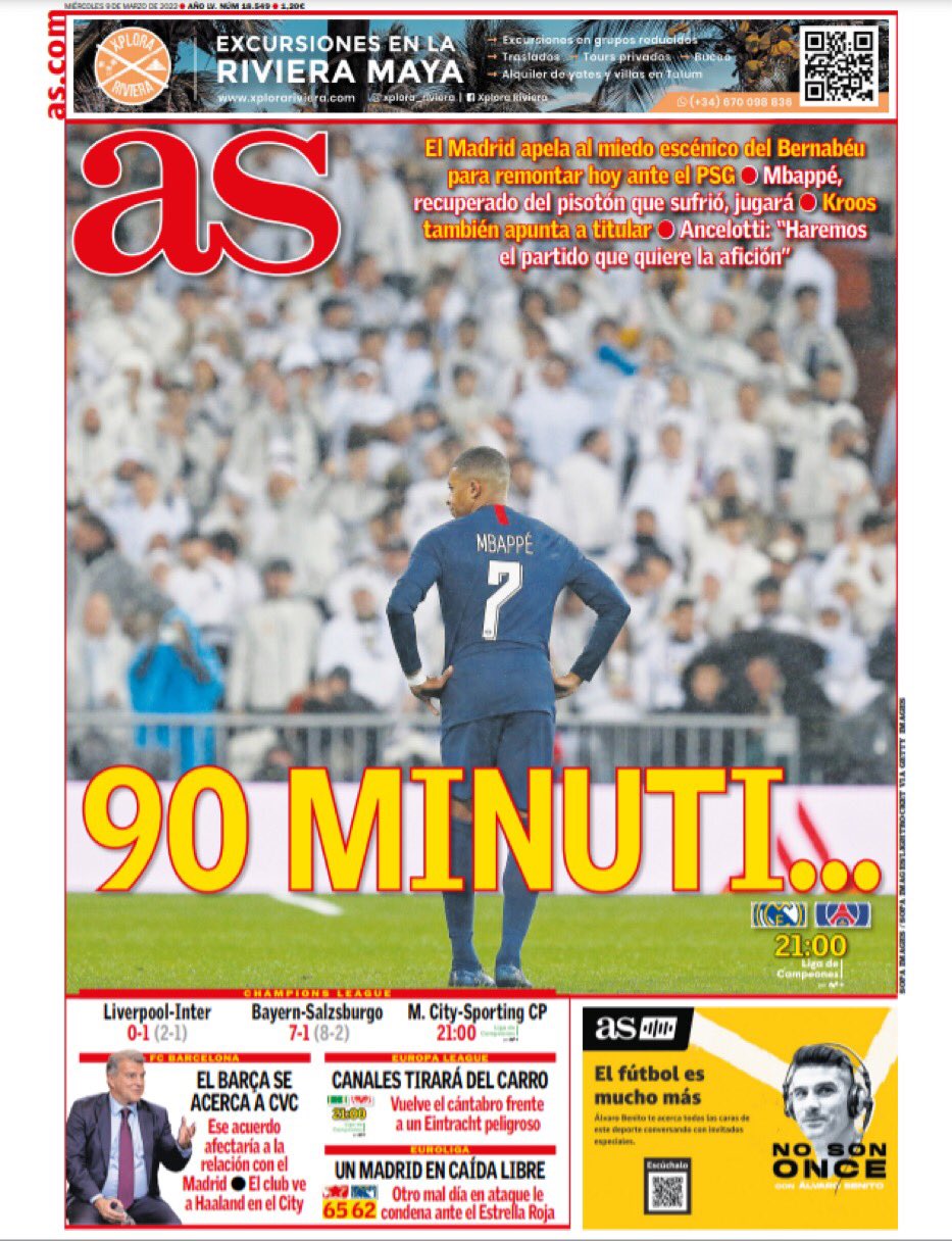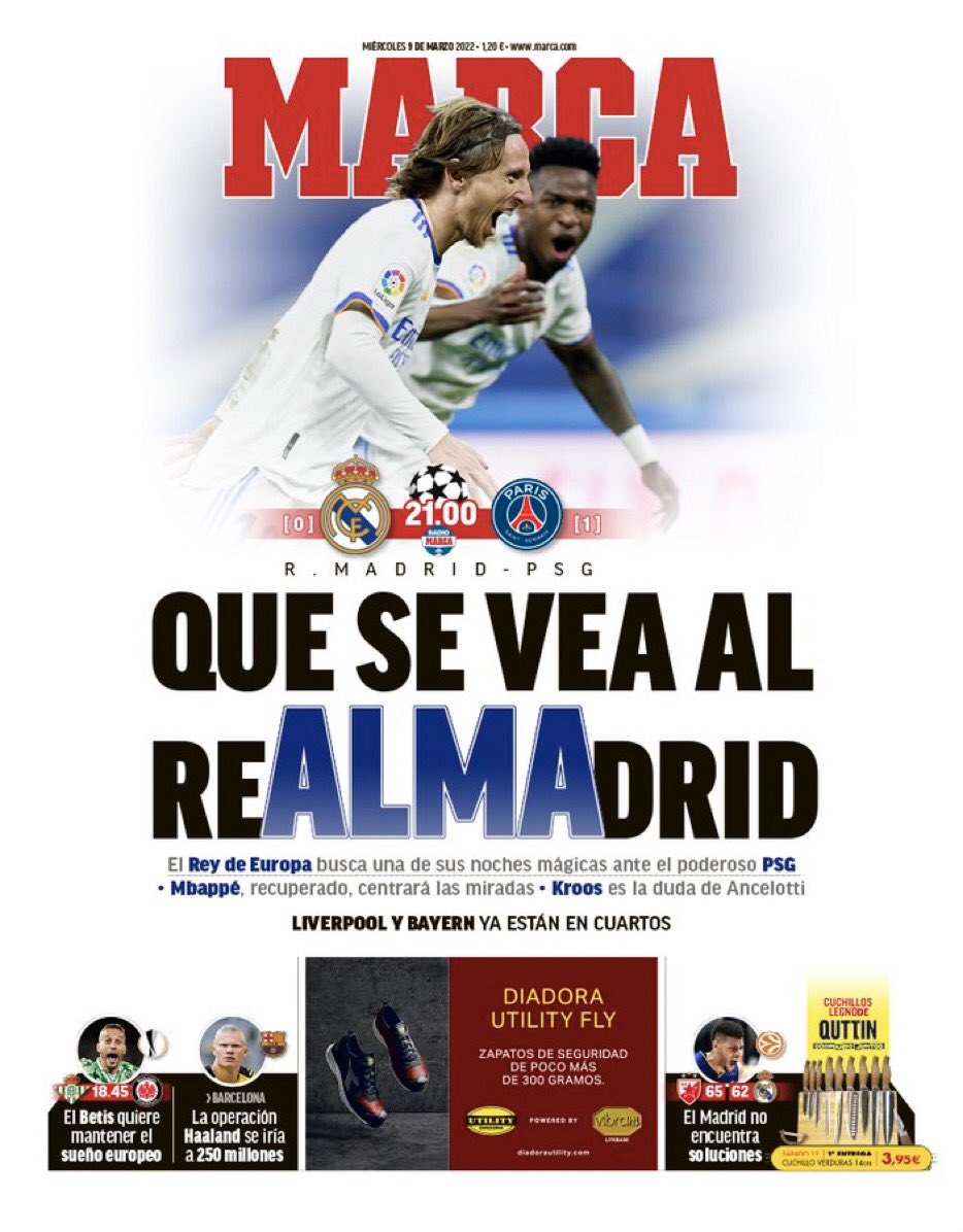 marchio Giocando con le lettere Cosa succede a RealMAdrid?. questo significa “Ricordiamo che è il Real Madrid”, ma “alma” significa anche “anima”. La rivista continua: “I re d’Europa hanno bisogno di una delle loro serate magiche contro il grande Paris Saint-Germain”. o come titolo all’interno del giornale, “Re dello stato”. Toni Kroos, da tempo un punto interrogativo, dovrebbe partire. Diario S Sta cercando di essere suggestivo ed è solo in campo e per il titolo “90 minuti…”. Il giornale aggiunge “Il Real Madrid spera di affrontare il Bernabeu bollente per affrontare il Paris Saint-Germain”.