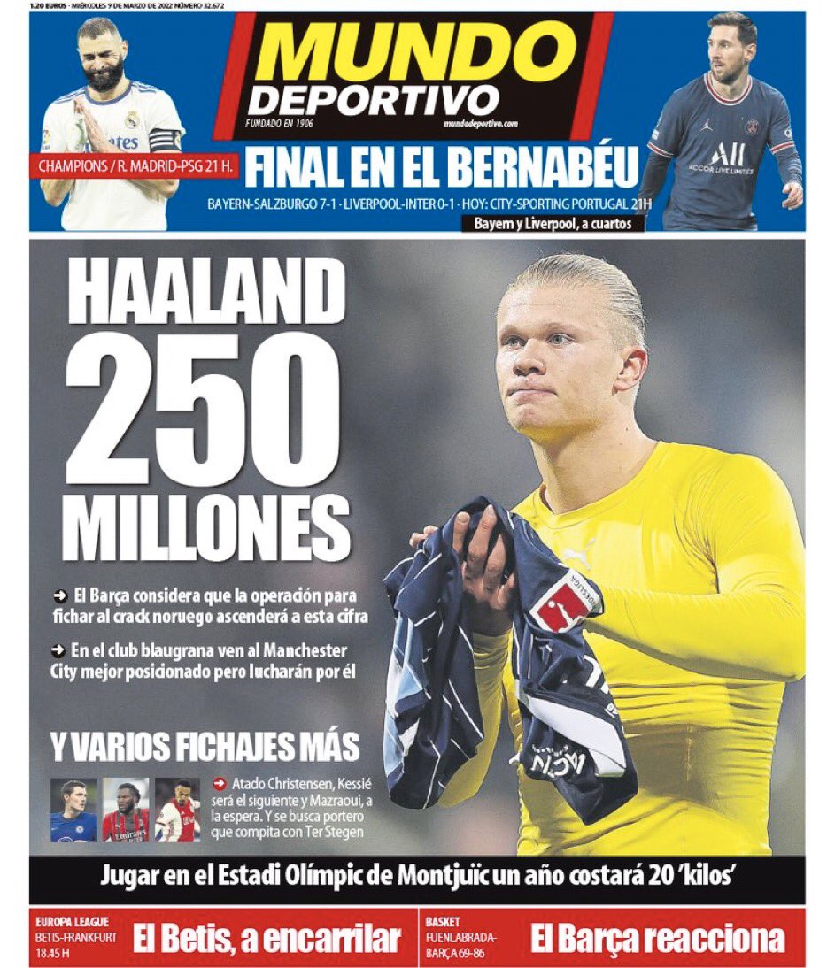 Gli sport E il Mundo Deportivo Stesso focus: Erling Haaland e Barcellona. Gli sport: “È possibile”. Mondo Sportivo: 250 milioni di euro. Quest’ultimo è quanto calcola il Barcellona nel costo totale del norvegese. Il Manchester City è considerato il principale contendente. Sport ha anche scritto che il Barcellona già offerto un contratto Al terzino destro Nossair Mazraoui, il cui contratto con l’Ajax è in scadenza. Le informazioni provengono dallo specialista dei trasporti Fabrizio Romano. Nella foto anche Milan e Dortmund. MD crede che Barcellona Obiettivo per quattro reclute estive. Haaland Amal, Frank Casey e Andreas Christensen sono vicini, Mazraoui è una chance. Tuttavia, il MD afferma che il Chelsea intende correre l’anno di opzione per Cesar Azpilicueta. Pertanto, il 32enne non poteva essere reclutato gratuitamente senza il suo costo. Al Barcellona non interessa. Lo sport altrove dice che il Camp Nou lo farà Si chiama Spotify Camp Nou Quando l’arena ricostruita verrà utilizzata nel 2025. Nella stagione 2023/2024, il Barcellona giocherà nell’Estadi Olímpic de Montjuïc.