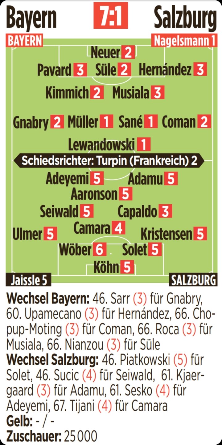 foto Segui il Bayern Monaco che va avanti come un battello a vapore in casa (7-1 contro l’RB Salisburgo). “Era un permesso con un punto esclamativo, dice il portiere Manuel Neuer. L’immagine è disseminata del punteggio più alto della squadra. Thomas Muller, Leroy Sane e, naturalmente, i tre tiratori Robert Lewandowski hanno il punteggio più alto di 1 su 6 – Tutti i punteggi sono qui.