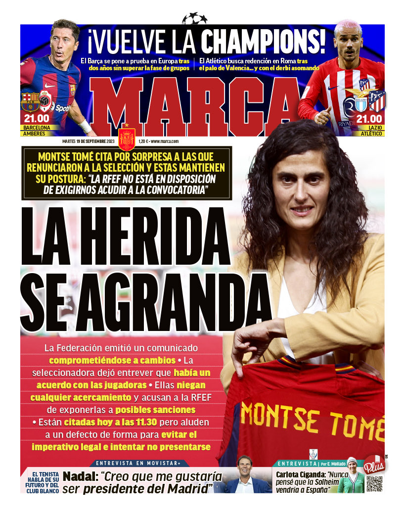 Lui cammina Fare molto affidamento su quello “La ferita si allarga” Mentre AS afferma che ora prevale “guerra aperta”. Si tratta, ovviamente, della Federazione spagnola e della Nazionale femminile. I vincitori della Coppa del Mondo sono stati invitati contro la loro volontà alle partite contro Svezia e Svizzera. In una lettera aperta, i giocatori hanno confermato la loro opposizione. Anche Jenny Hermoso, al centro dello scandalo Luis Rubiales, ha pubblicato una dichiarazione in tarda serata. Il nuovo capitano della nazionale Montse Tommy non l’ha inclusa nella squadra perché “È stato “Il modo migliore per proteggerla.”, come ha detto Tommy. La lettera di Hermoso porta questo titolo. “Proteggermi da cosa?” (essere visto Il messaggio è qui). Lei continua: “Per settimane e mesi abbiamo cercato protezione all’interno della Federcalcio spagnola e non l’abbiamo ottenuta. Le stesse persone che chiedono la nostra fiducia hanno scelto oggi di convocare i giocatori che hanno chiesto di non essere convocati”.. Hermoso la pensa così “È un’altra strategia di divisione e manipolazione che ci intimidisce e ci minaccia con conseguenze legali e sanzioni finanziarie”.. Relevo indulgere Quanto è caotico. 1/ Non sono stati contattati molti giocatori per la selezione, anche se Tommy ha affermato di esserlo stato. 2/ Indipendentemente dalle circostanze relative alla selezione, i giocatori all’estero non hanno viaggi con cui connettersi. 3/ Non è previsto il viaggio in Svezia già pronto, anche se la partita si giocherà venerdì a Göteborg. 4/ I club non sono stati informati della scelta delle squadre da parte della Federcalcio spagnola. Altre notizie: lo scrive AS Il Marocco è interessato Per contattare il giocatore del Real Madrid Brahim Diaz. Il capitano della CAF Walid Regragui era presente durante la partita contro la Real Sociedad. Il Marocco sperava da tempo di convincere il 24enne a cambiare la maglia rossa della Nazionale.