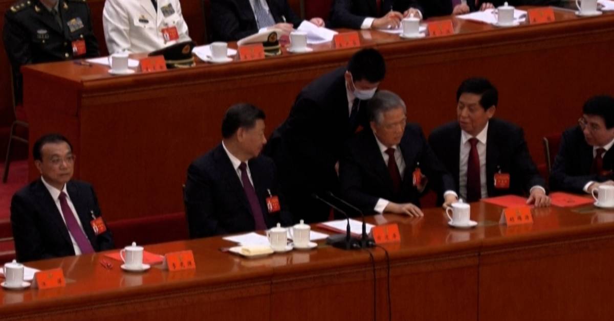 Qui, l’ex presidente Hu Jintao esce dalla cerimonia di chiusura