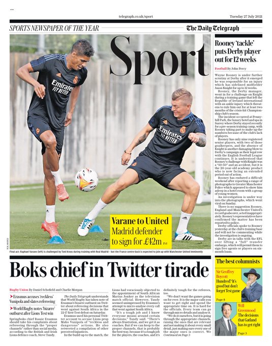 Daily Telegraph Copre la prima pagina con la mossa di Varane ma ha anche un altro cambio nella difesa dello United. Centrocampista, 23 anni, Axel Tuanzebe sta per partire E il Newcastle è interessato. Poi ci sono i titoli di spam di Wayne Rooney per il secondo giorno consecutivo. dopo, dopo Titolo scandalo del lunedì Monday Delle giovani donne, così come del Telegraph L’indirizzo dell’infortunio di oggi riguardo al giovane. Si è scoperto che era Rooney, l’allenatore del Derby County, che ha gestito male uno dei suoi giocatori durante una sessione di allenamento. Il centrocampista irlandese Jason Knight, 20 anni, starà fuori per un massimo di tre mesi per un infortunio alla caviglia.